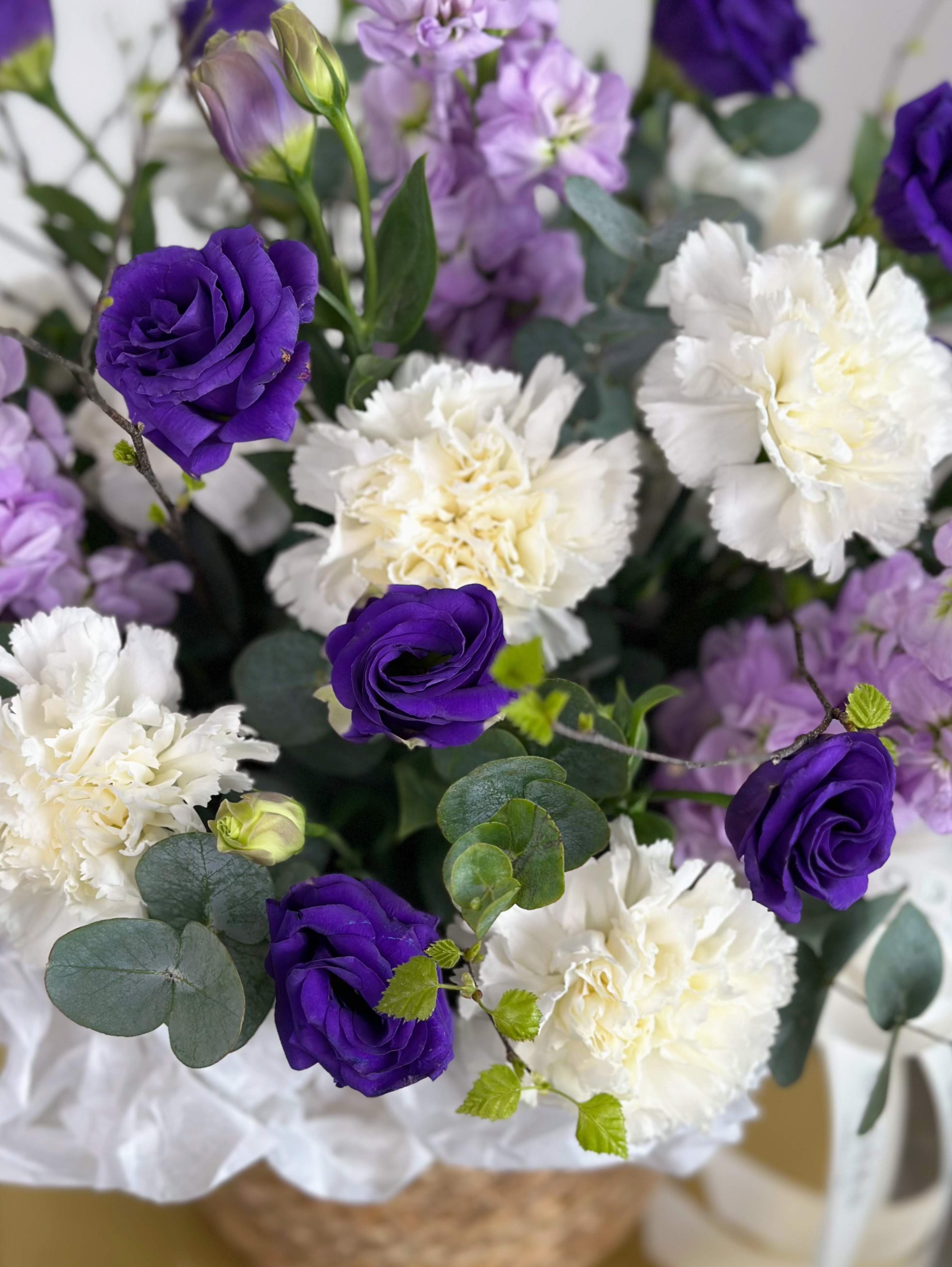 —АРОМАТНАЯ МАТТИОЛА, ЭУСТОМА, ВЕСЕННИЕ ВЕТОЧКИ В ПЛЕТЕНОЙ КОРЗИНЕ