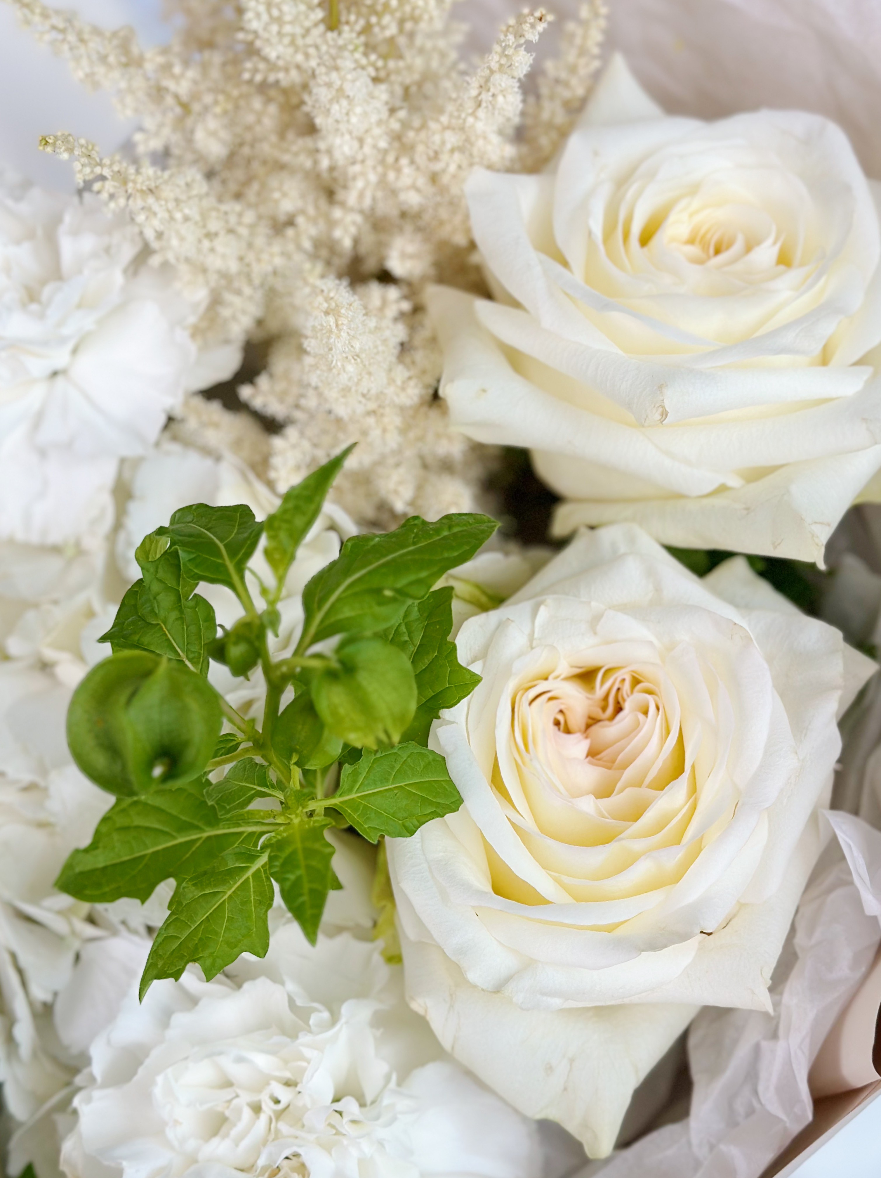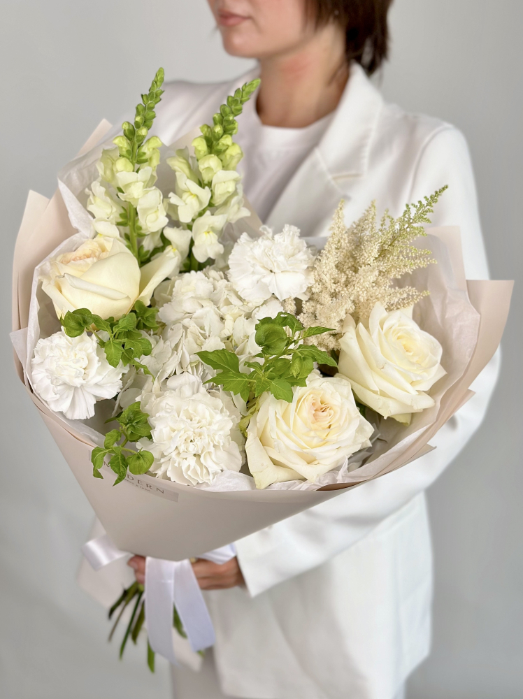 Представляем вашему вниманию воплощение элегантности и утонченности — изысканный букет в белоснежных тонах. В центре композиции — роскошные пионовидные розы и пышные соцветия гортензии, создающие неповторимую симфонию природной красоты.