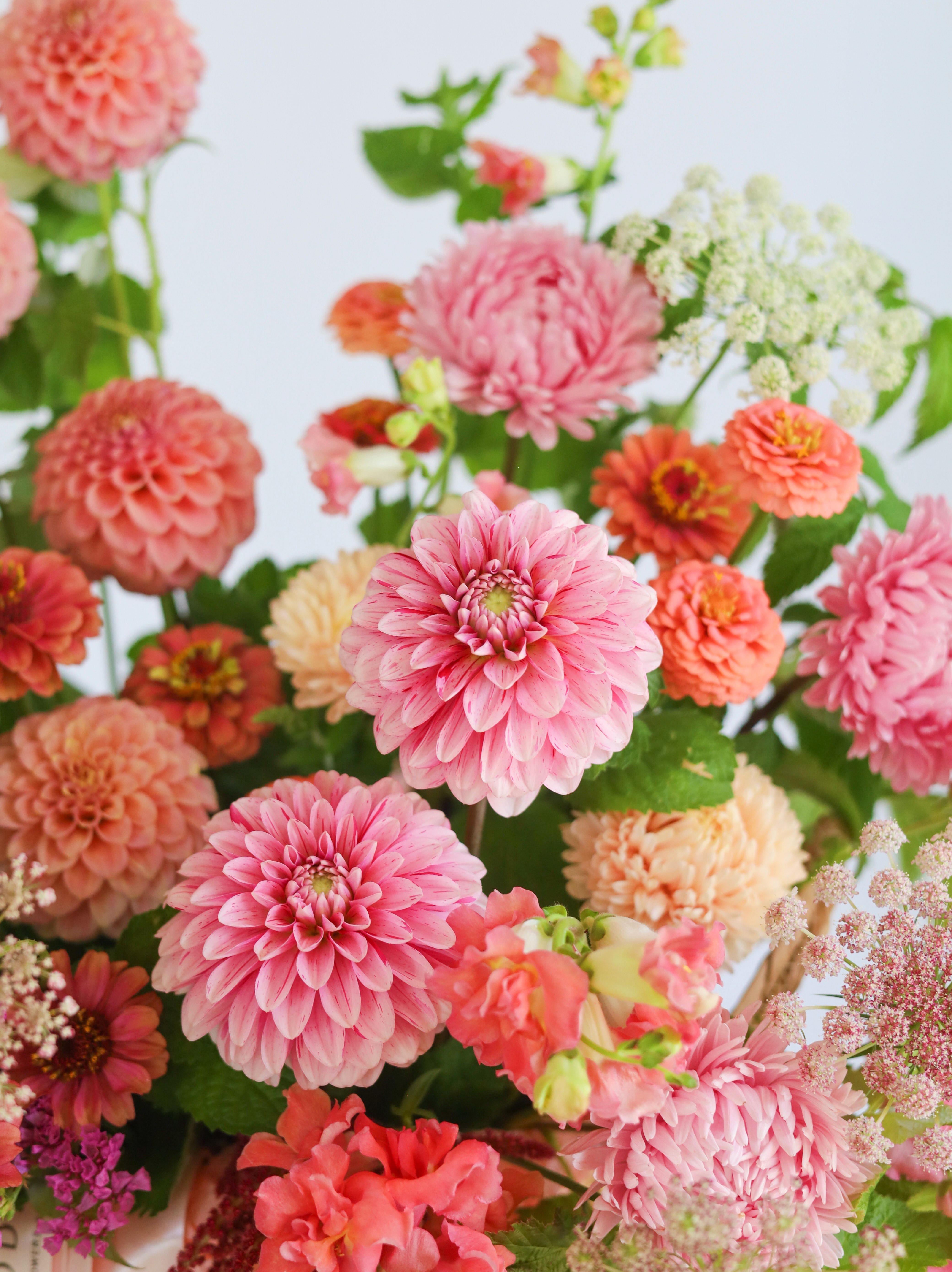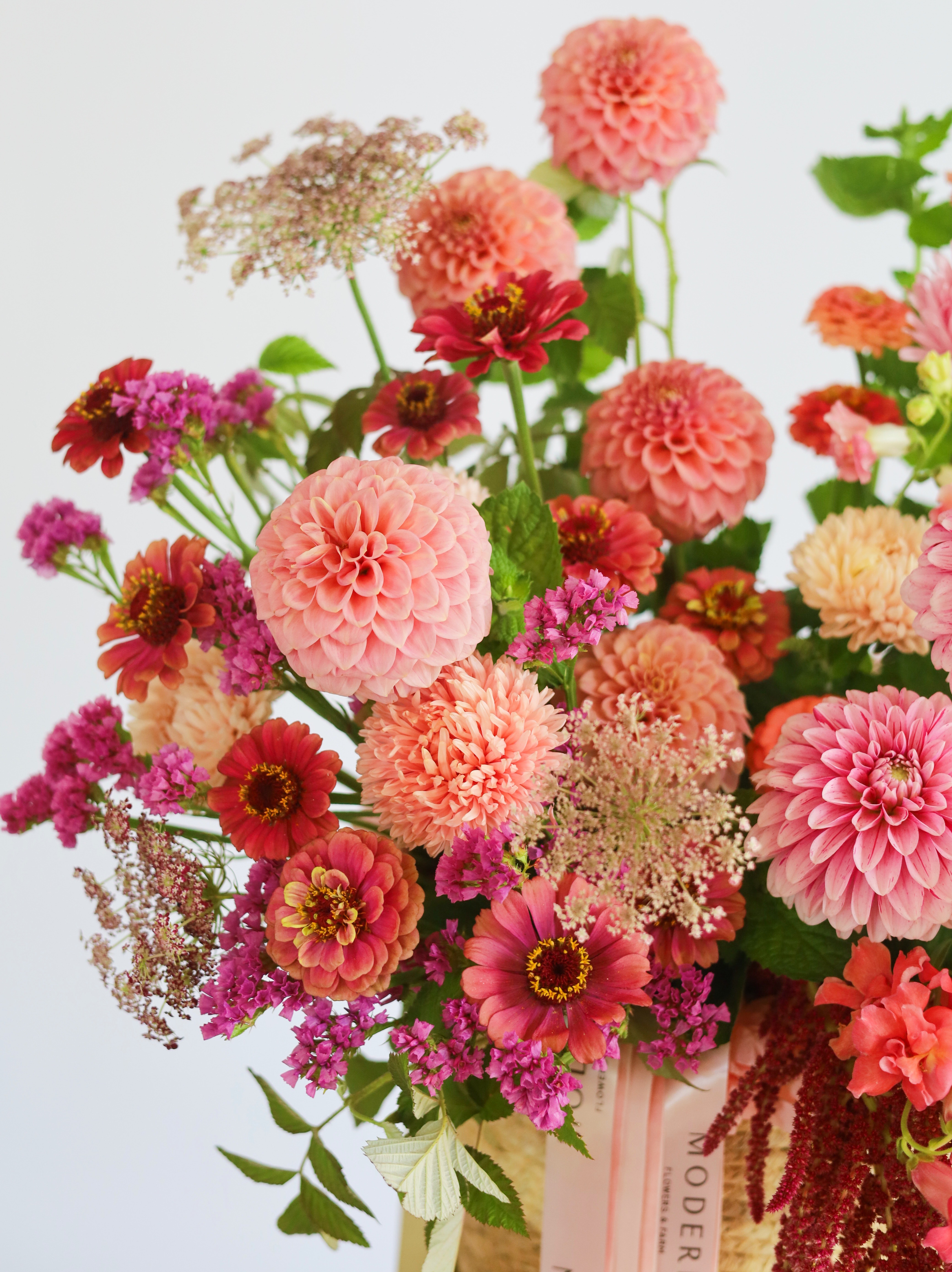 Цинния — яркий акцент композиции, привносящий в букет жизнерадостность и энергию своими насыщенными соцветиями.
