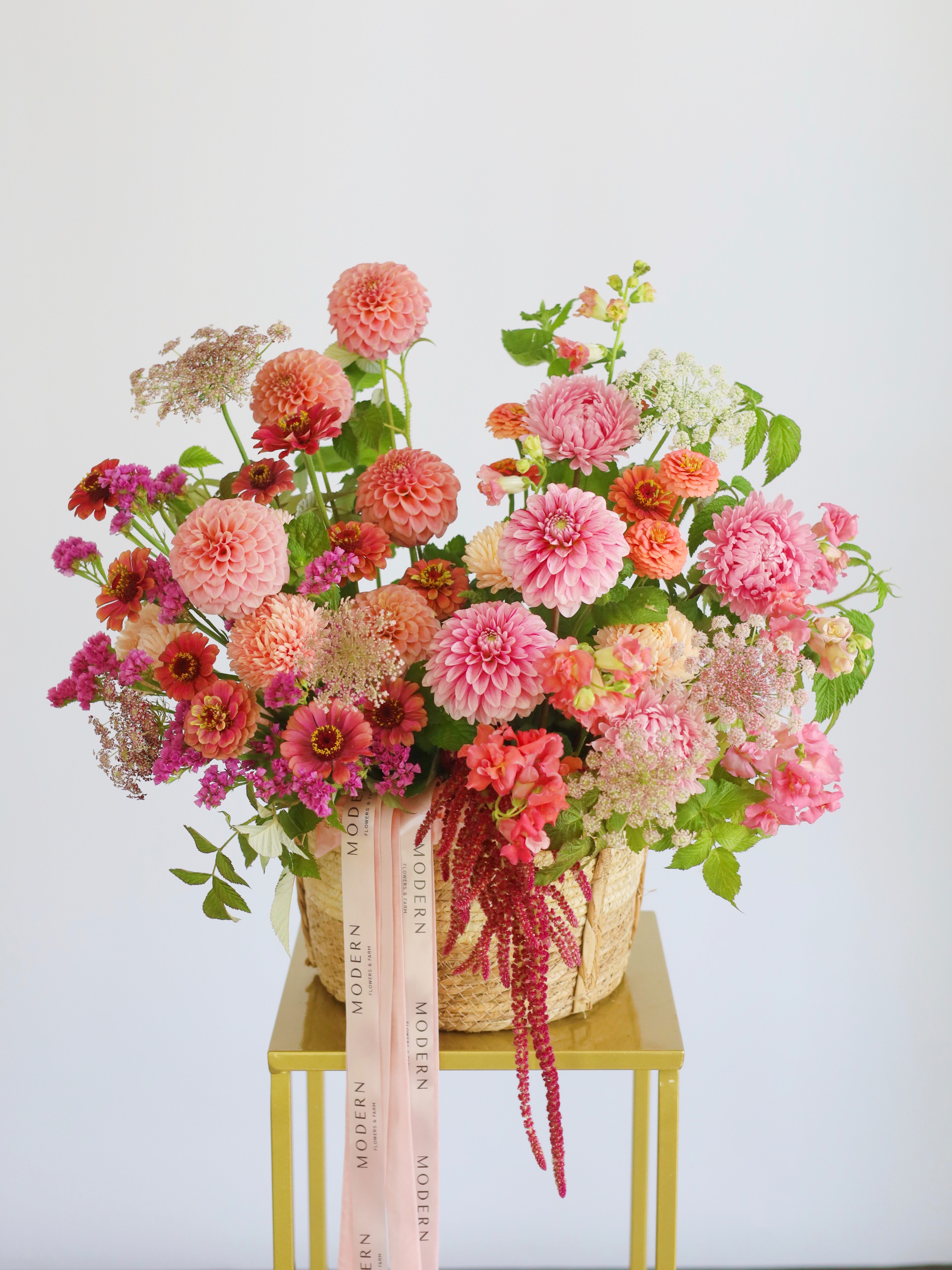 БОЛЬШАЯ КОРЗИНА С ГЕОРГИНАМИ, АМАРАНТОМ И ЦИННИЕЙ