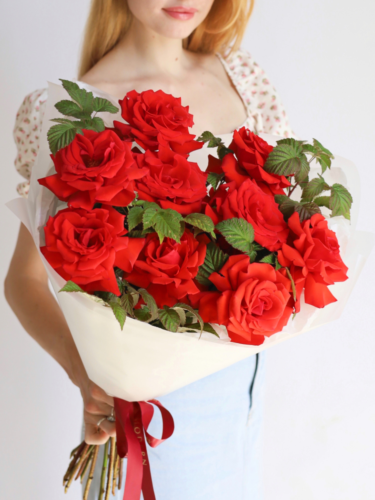 —БУКЕТ С АЛОЙ ФРАНЦУЗСКОЙ РОЗА NINA И ВЕТОЧКАМИ МАЛИНЫ