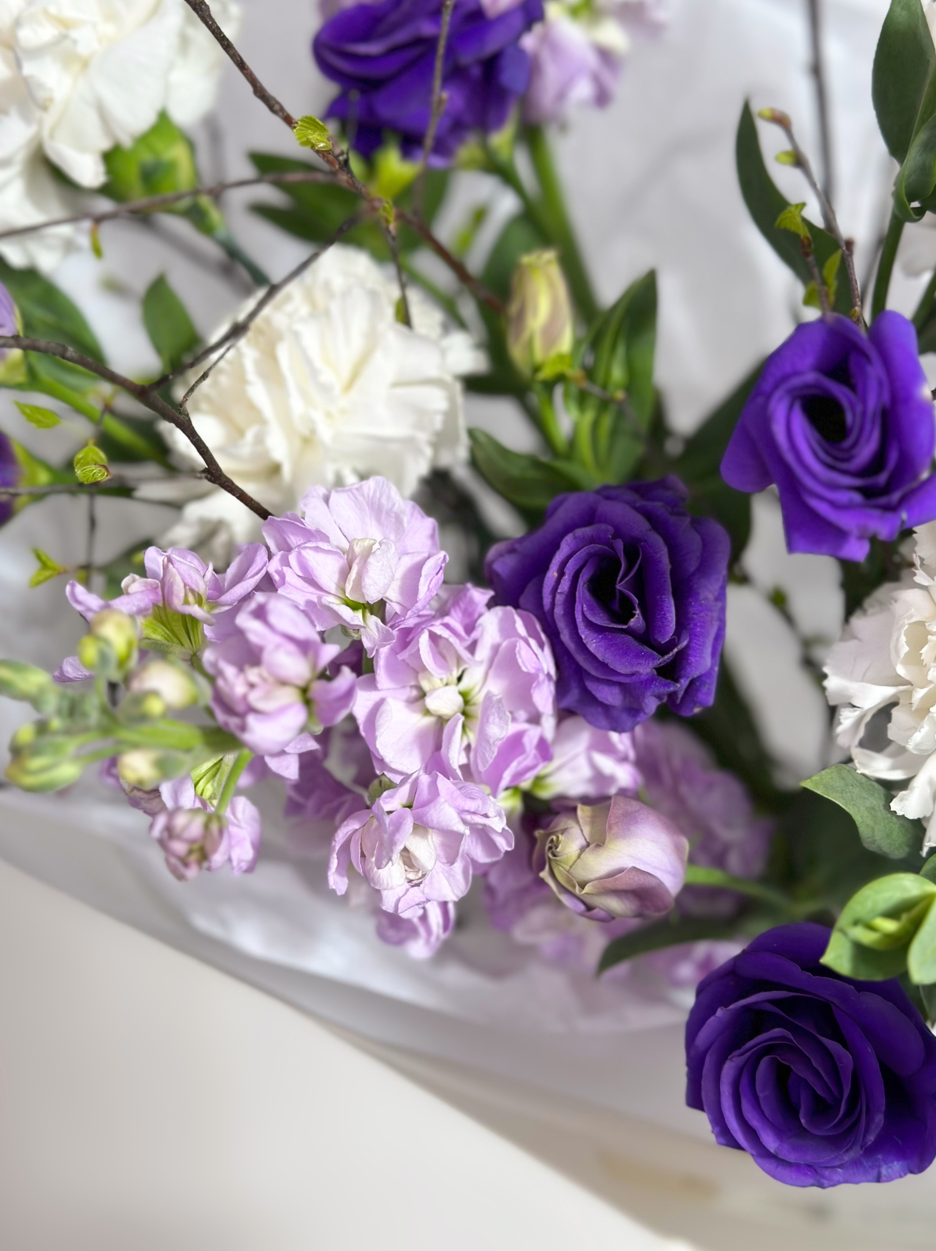 БУКЕТ С АРОМАТНОЙ МАТТИОЛОЙ, ЭУСТОМОЙ И ВЕСЕННИМИ ВЕТОЧКАМИ