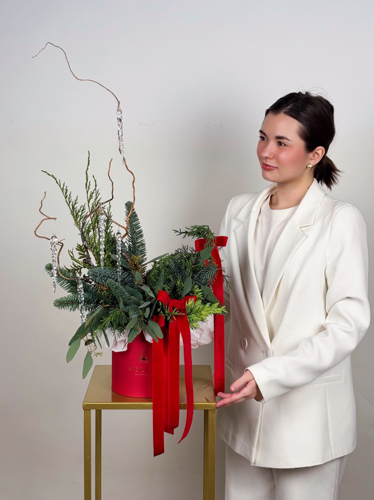ТОРЖЕСТВЕННАЯ ХВОЙНАЯ КОМПОЗИЦИЯ В БАРХАТНОЙ КОРОБКЕ