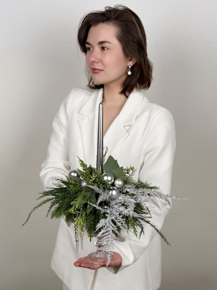 ХВОЯ В БОКАЛЕ СО СВЕЧЕЙ СЕРЕБРИСТОМ ОТТЕНКЕ