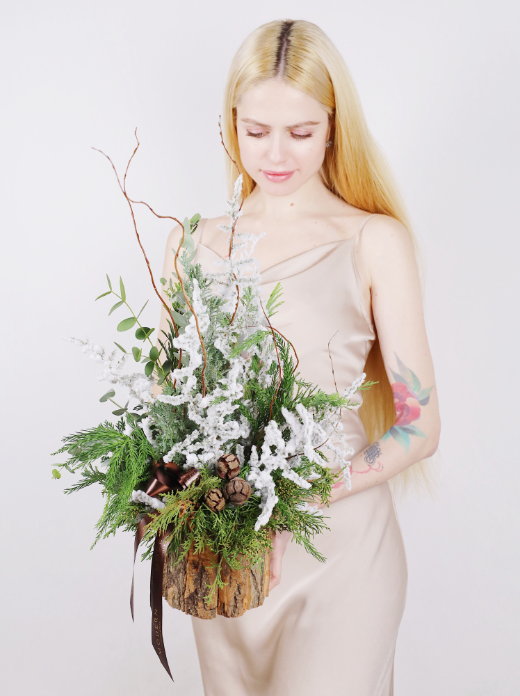 ХВОЙНАЯ КОМПОЗИЦИЯ В ДЕРЕВЯННОМ КАШПО
