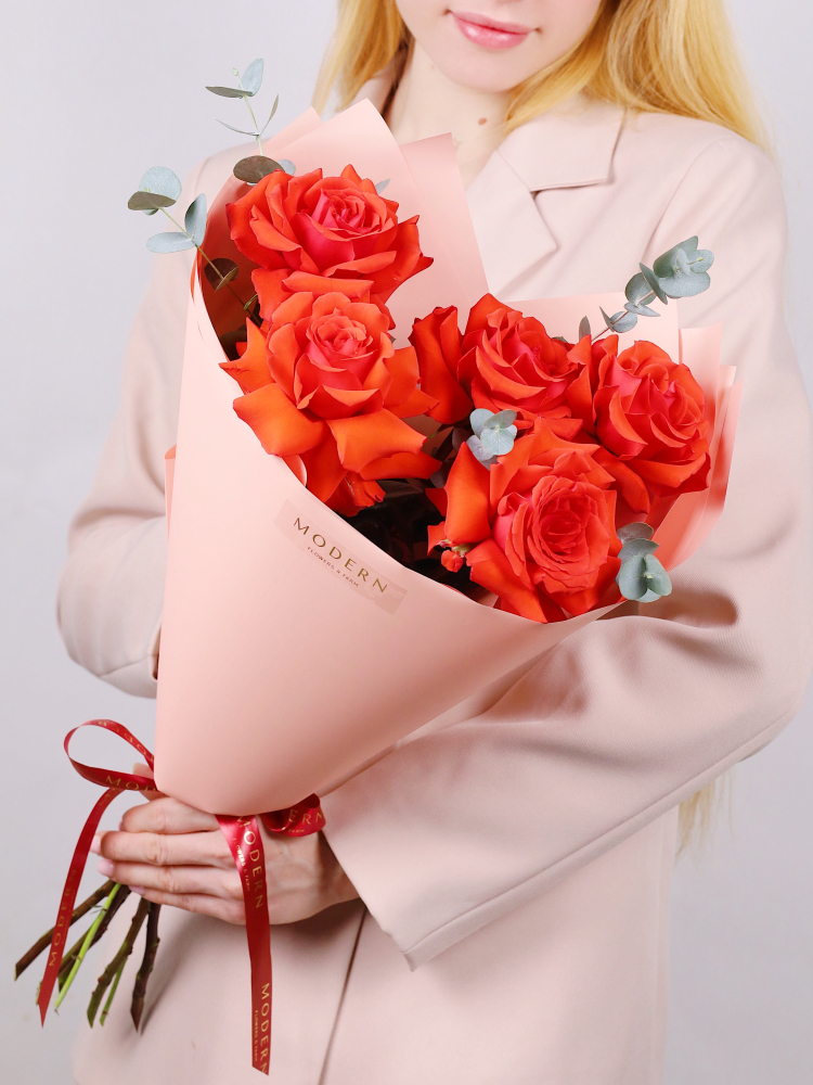 БУКЕТ ИЗ СТОЙКОЙ АЛОЙ ФРАНЦУЗСКОЙ РОЗЫ И ЭВКАЛИПТА