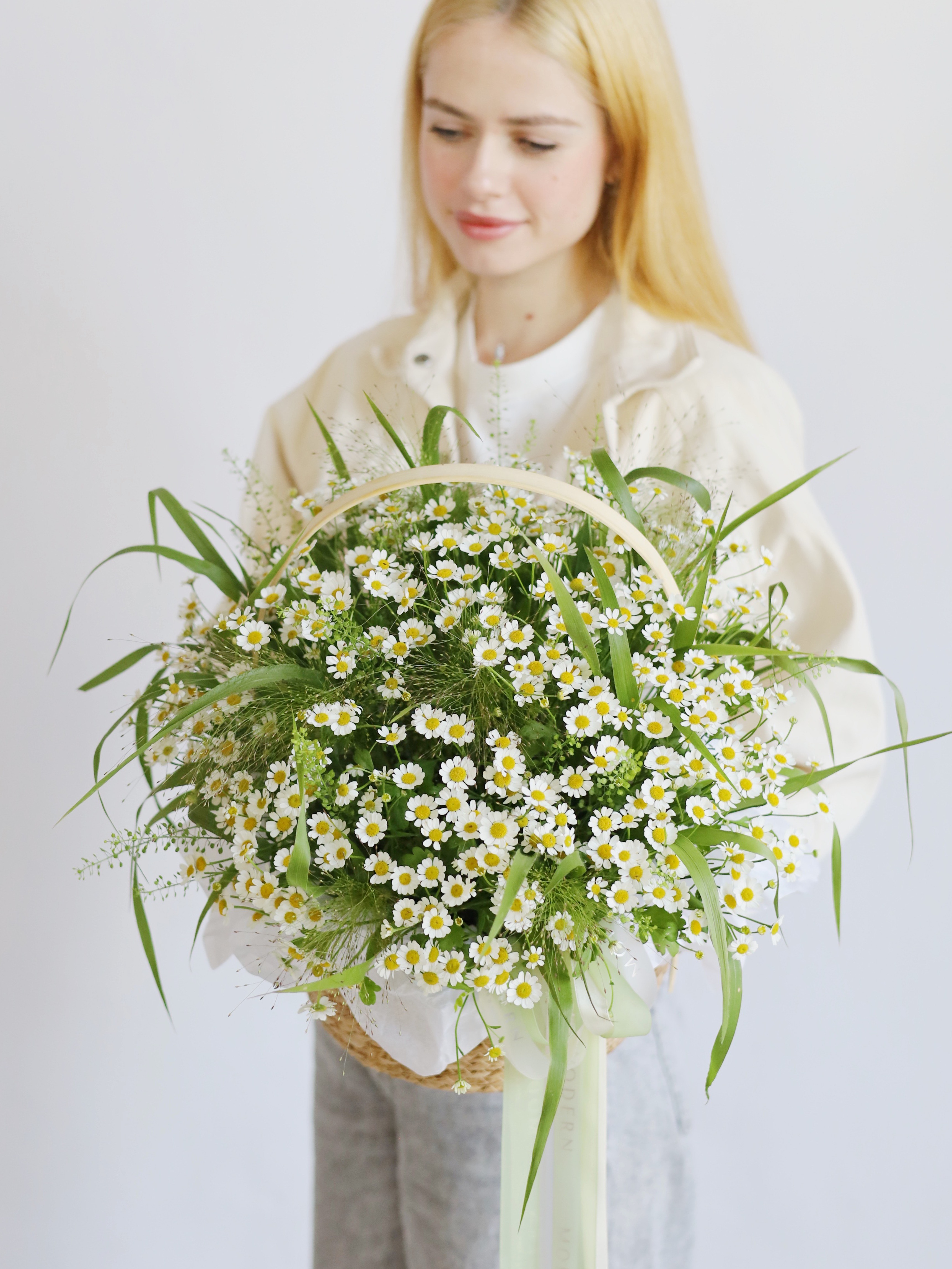 Изящная корзина с ромашками и злаками: природная красота в каждом элементе