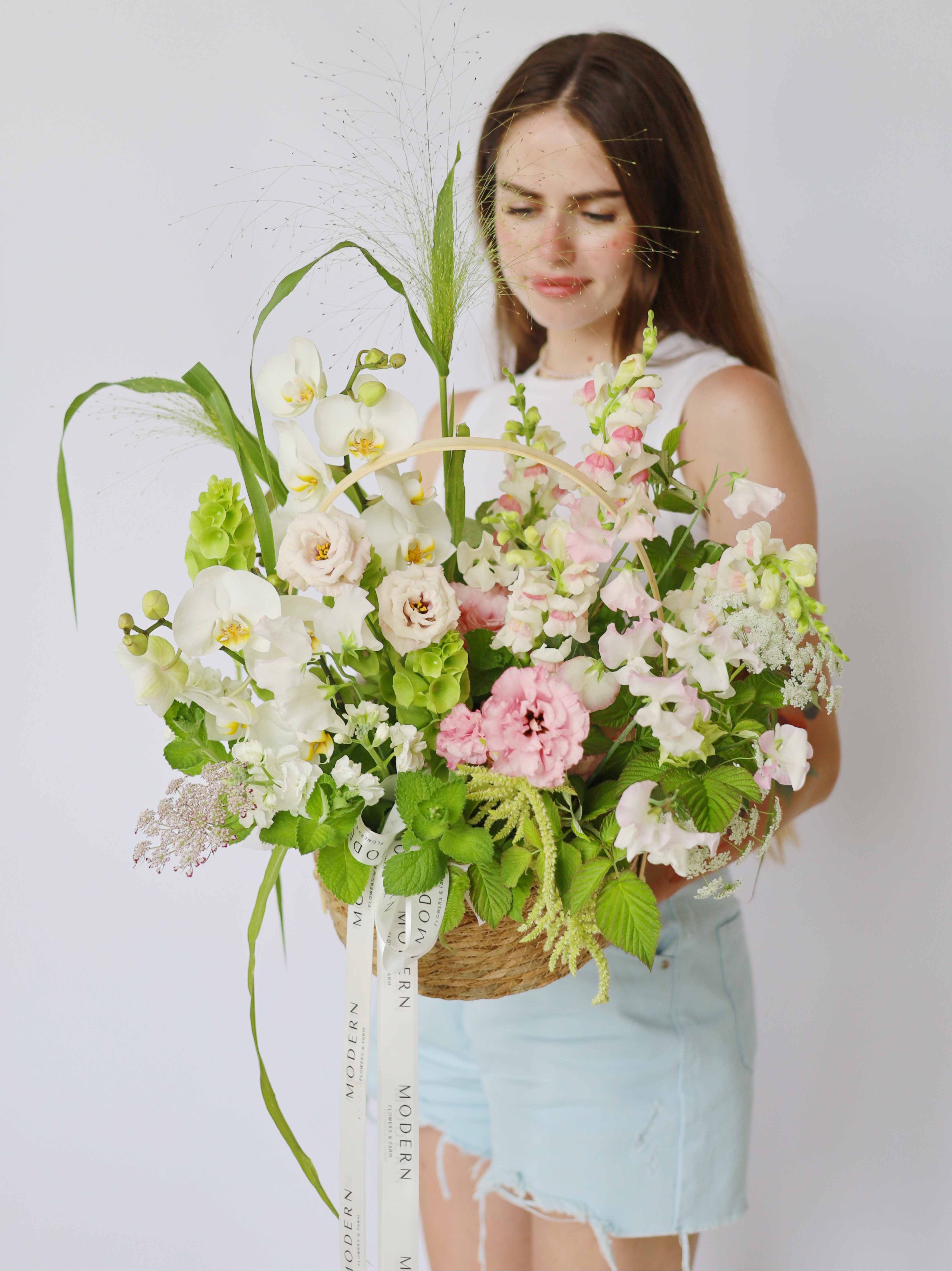 (!) В составе данного букета использованы сезонные летние цветы, мы соберем для вас похожий букет из имеющихся цветов в похожей стилистике и цветовой гамме.