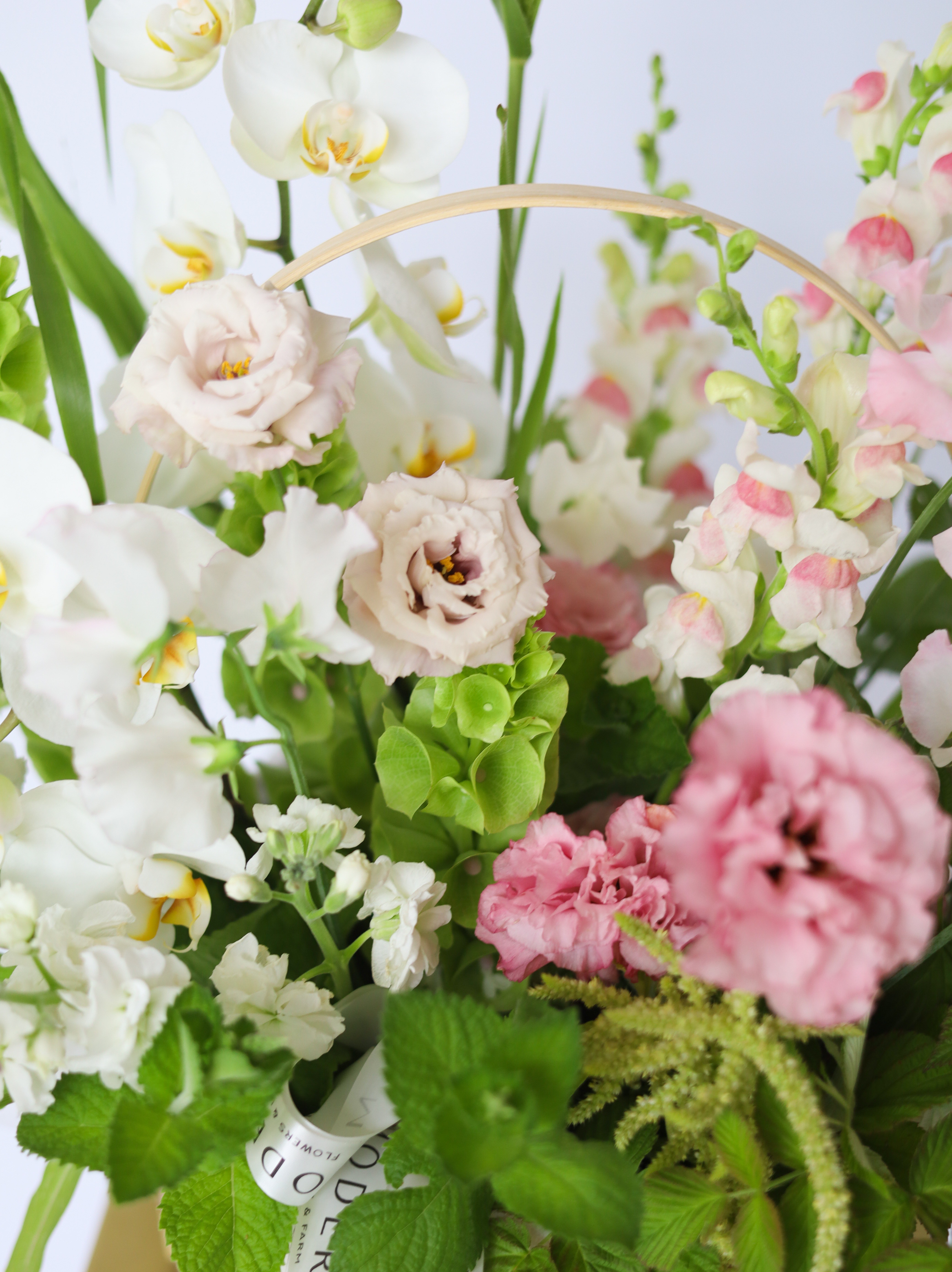 Представляем вашему вниманию утонченную цветочную композицию, где элегантность орхидей гармонично сочетается с очарованием сезонных летних цветов.