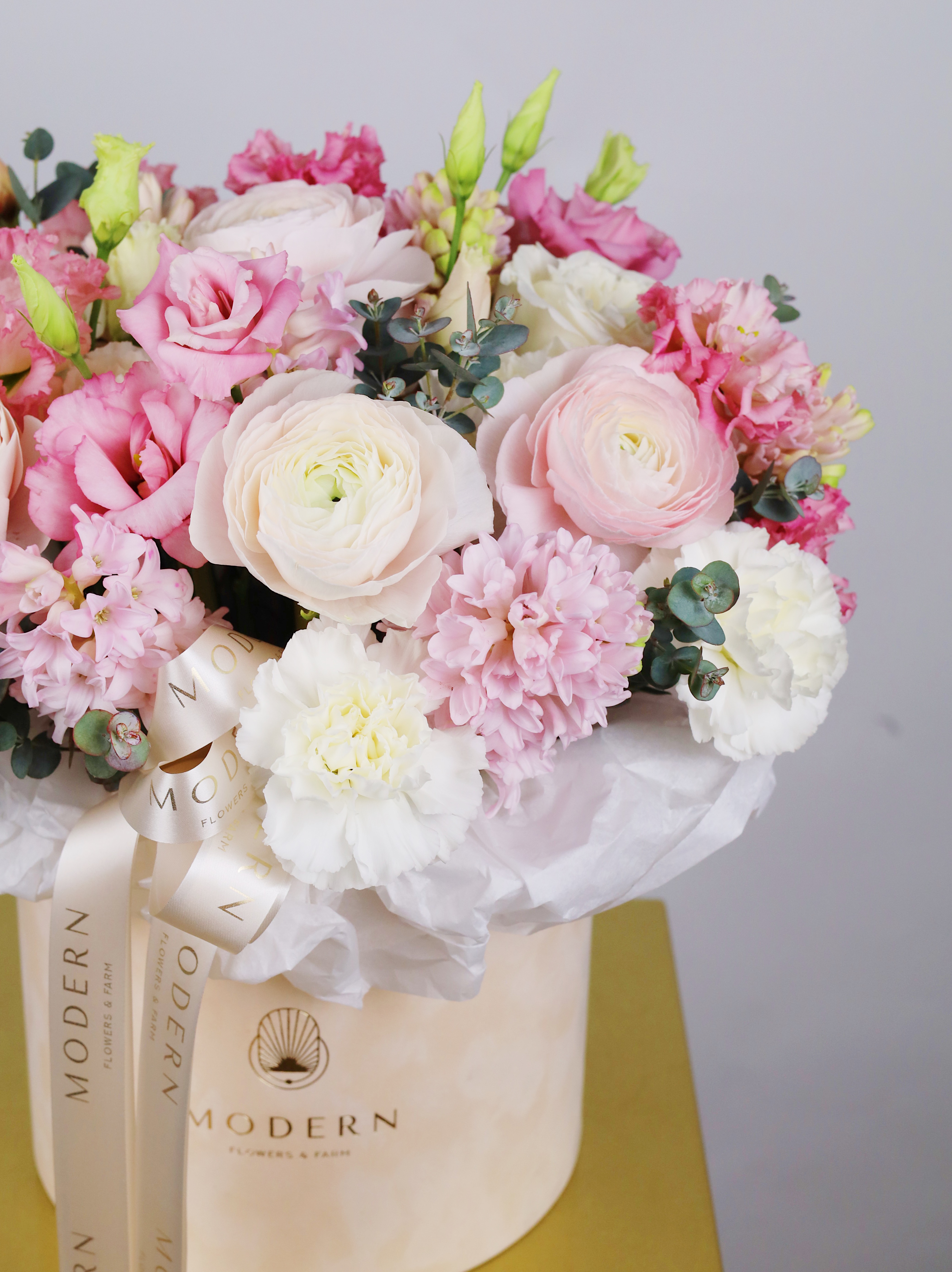 РАНУНКУЛЮС, ГИАЦИНТ, ЭУСТОМА В БАРХАТНОЙ КОРОБКЕ