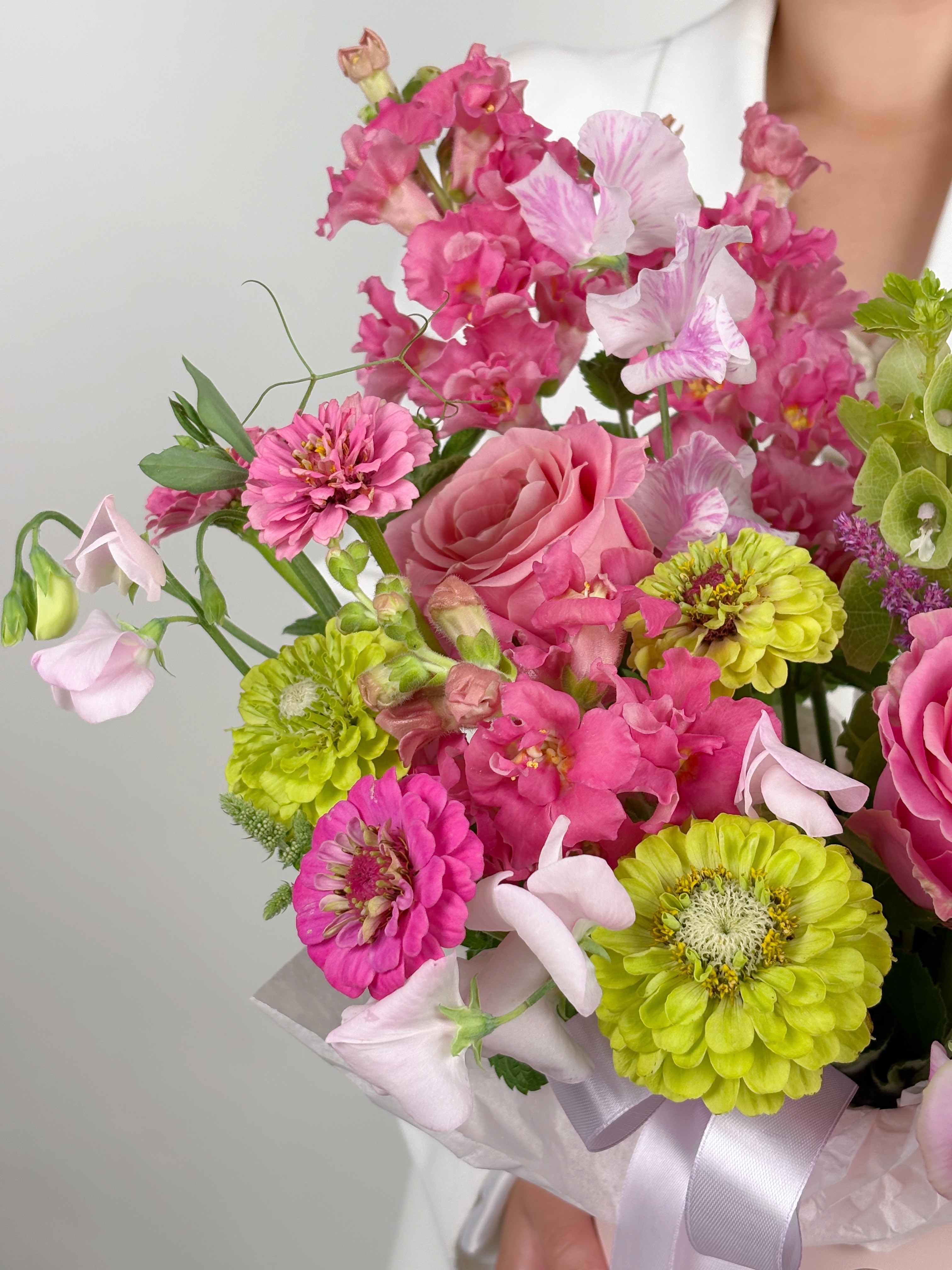 —СОЧНАЯ КОМПОЗИЦИЯ В ШЛЯПНОЙ КОРОБКЕ С РОЗОЙ И ДУШИСТЫМ ГОРОШКОМ