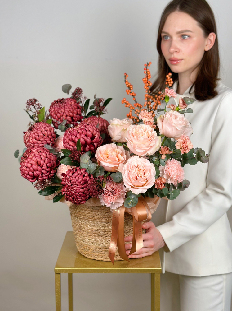 КОРЗИНА В ОСЕННИХ ТОНАХ С ПИОНОВИДНОЙ РОЗОЙ