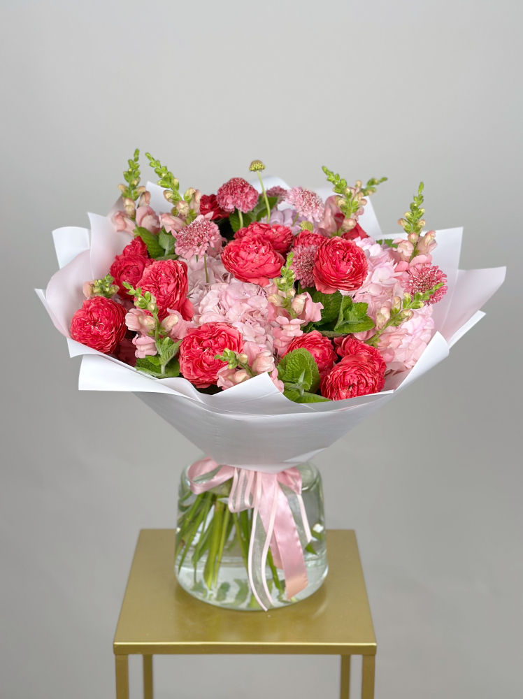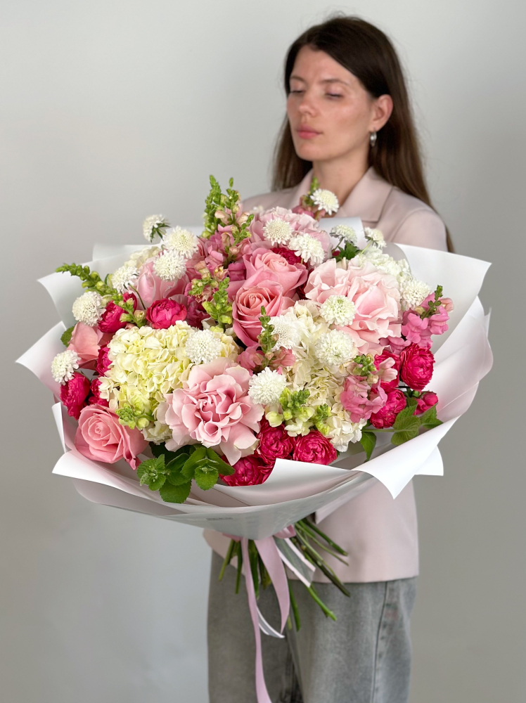 БОЛЬШОЙ БУКЕТ С ГОРТЕНЗИЕЙ И ПИОНОВИДНОЙ РОЗОЙ
