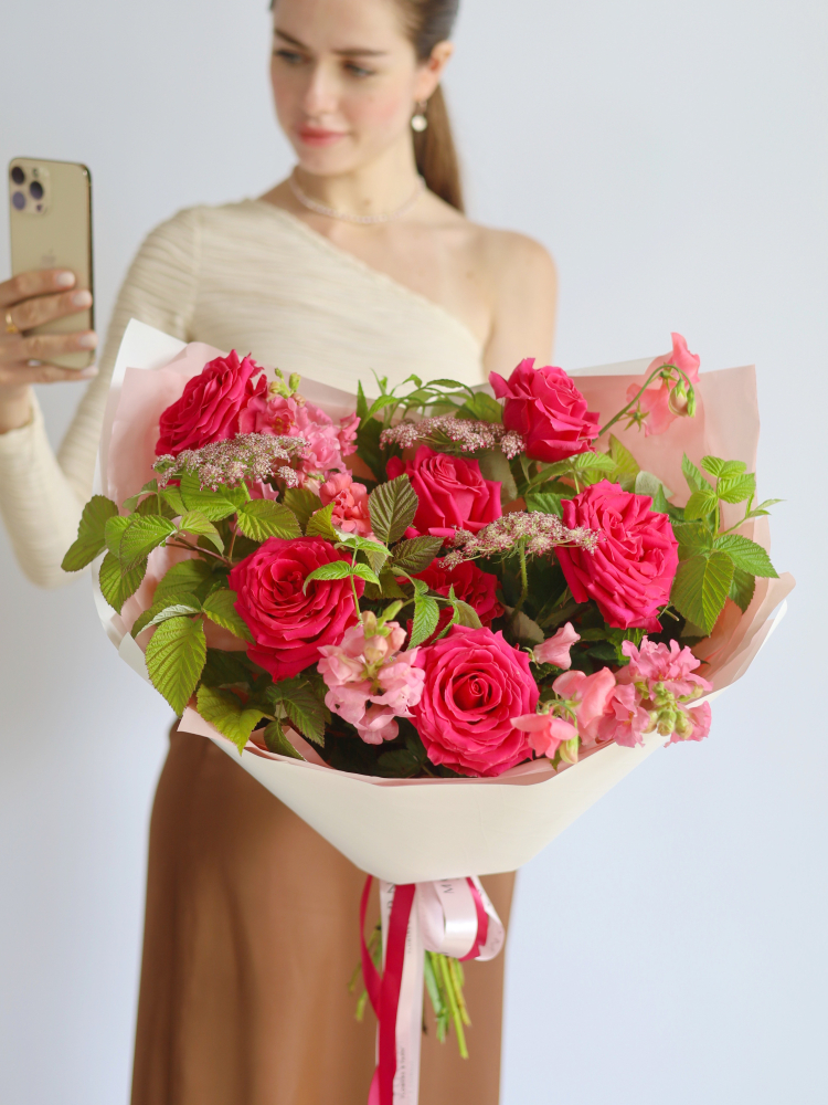 Мы предлагаем не только монобукеты, но и большой выбор микс-композиций. В них кустовые розы дополнены другими растениями: