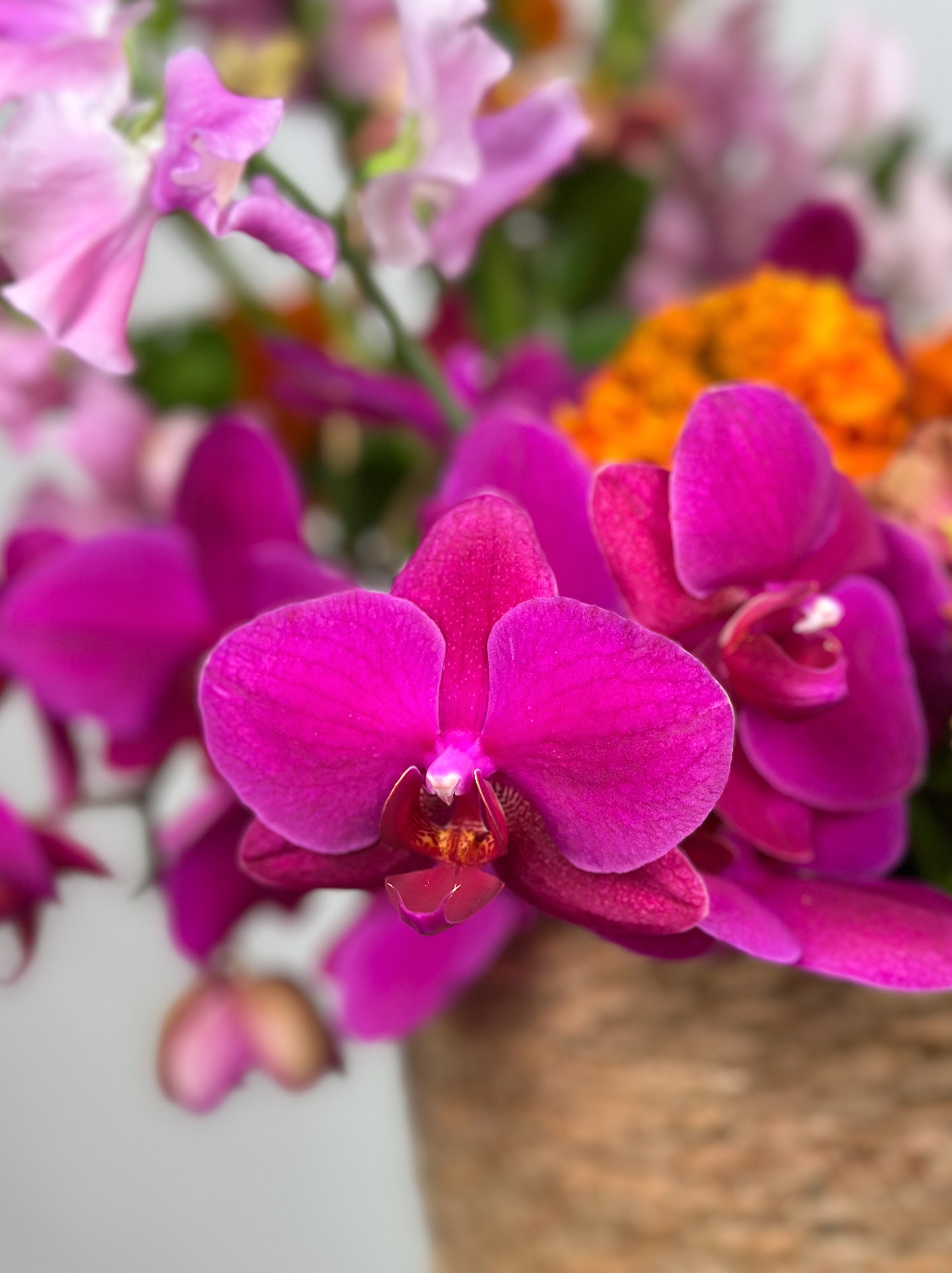Представляем вашему вниманию утонченную цветочную композицию, где элегантность орхидей гармонично сочетается с очарованием сезонных летних цветов.